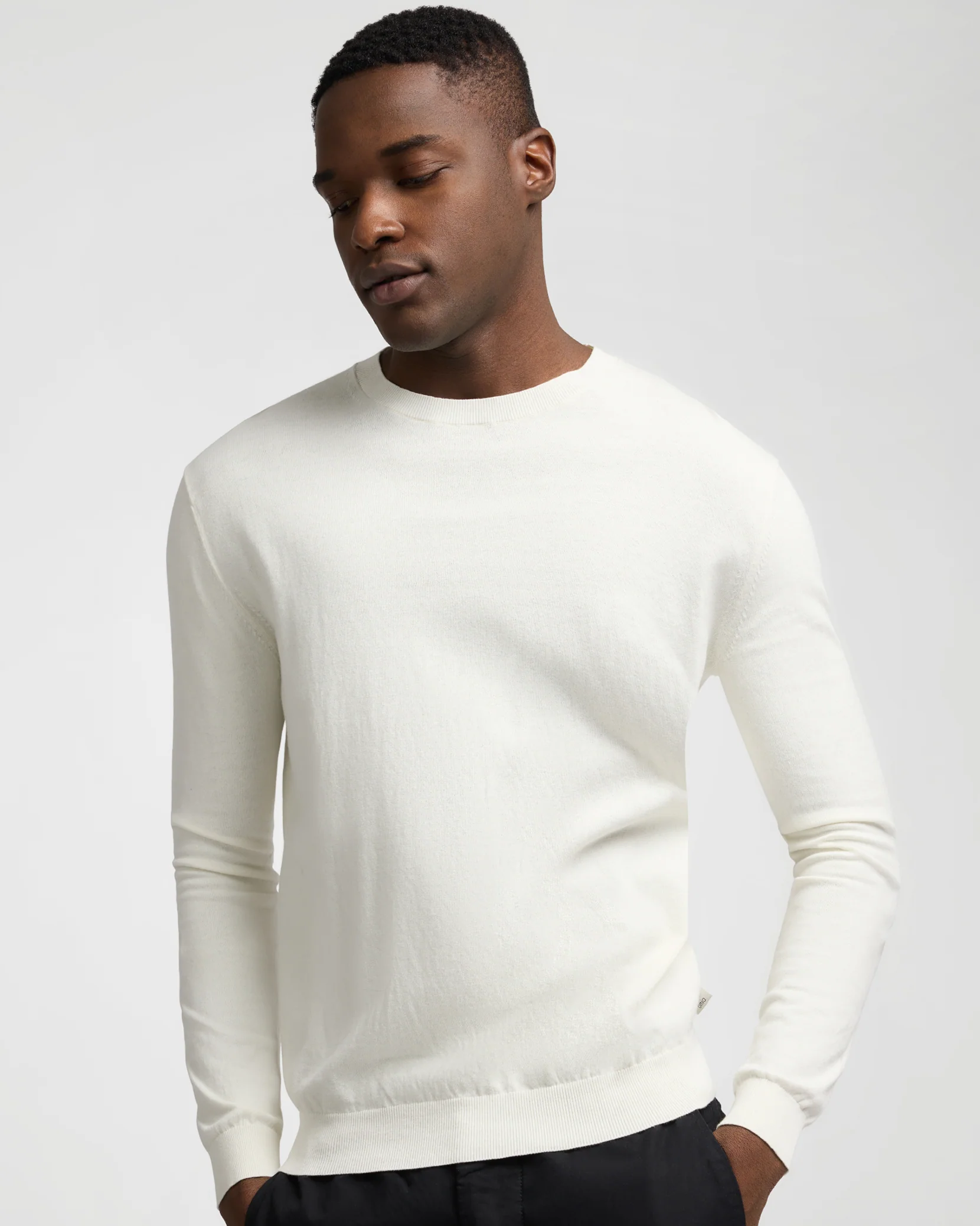 The Fine Cotton Knit Long Sleeve Crewneck Sweater pairs well with the Linen Cotton Stretch Cuff Pant.
