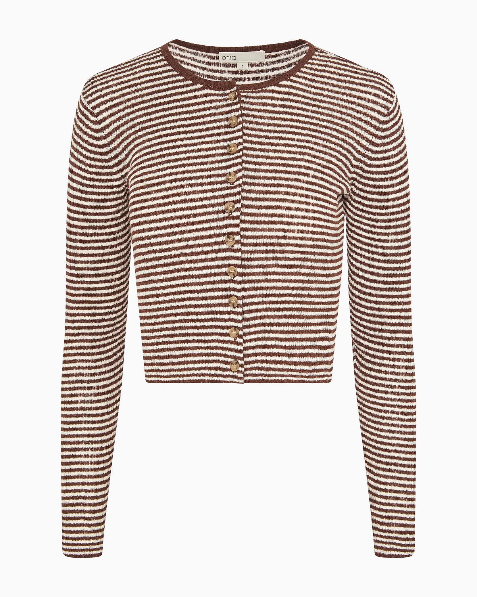 This cardigan is knit from textured linen yarns with ribbed cuffs and waistband. The relaxed fit offers ease while maintaining structure through the trim.